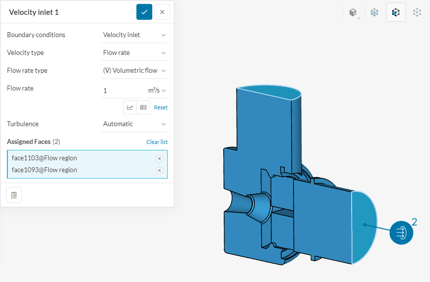 2. A flow rate boundary condition assigned to more than one surface of the fluid domain means that each surface receives the specified flow rate.