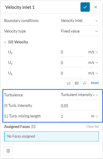 When the Turbulent intensity and mixing length option is selected, the user can specify the turbulent intensity \((I)\) and the turbulent mixing length \((L)\).