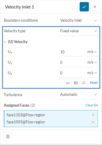 The Fixed value type prescribes the velocity magnitude and direction on the selected surface(s). It is fixed by defining each velocity component in the x, y, and z directions. Here is an example of how to assign a velocity entering an inlet at 10 \(\frac{m}{s}\) in the x-direction: