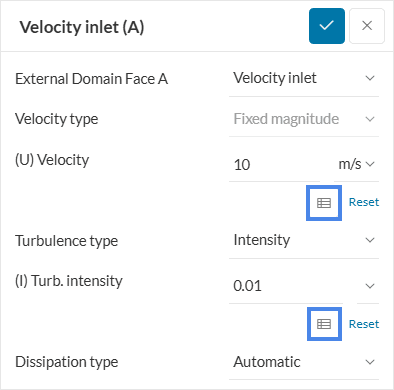 For Turbulence type, two approaches are possible: Intensity and Turbulence kinetic energy. With the latter, the user explicitly defines the turbulence kinetic energy at the inlet (via uniform or table definitions).