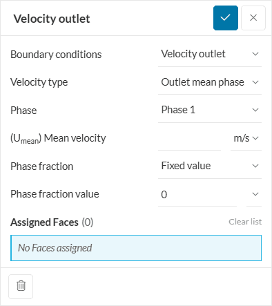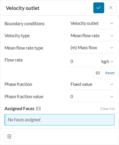 This is an outlet-only boundary condition available for the Multiphase analysis type. The average mass or volumetric flow rate over the boundary defines the velocity outlet. The assigned values must be positive.