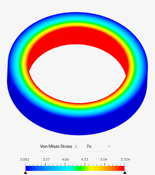 Figure 2: Stress contour plot of a ring subject to a centrifugal force, modeled with a volume load (see validation case below).