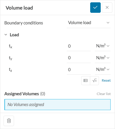 Figure 1: Volume load boundary condition panel. Enter the value in each direction with appropriate units and pick volumes to assign.