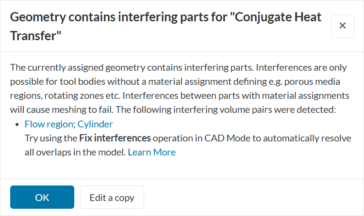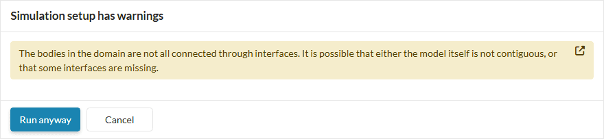 As all possible interfaces are detected automatically, it is not possible to manually add an interface or to change the entity assignment for a specific interface. In case no interfaces can be detected automatically, SimScale will show a warning message before running the simulation.