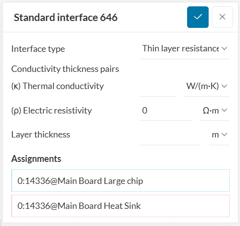 The Thin layer resistance allows modeling a layer with thickness \(t\) and thermal conductivity \(\kappa\), and \(\rho\) electric resistivity between the two interface regions.