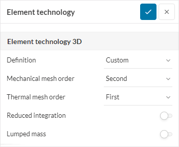 It is possible to select particular reduced integration and lumped mass configurations for the different parts of the model by creating different Element definitions in the simulation tree, just below the Element technology element. Please be aware that this option is only available when using the Custom definition.