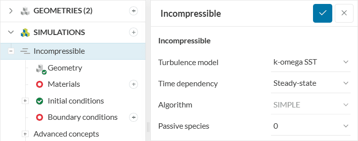Settings like the turbulence model, time dependency, and material behavior can be defined as part of the Global Settings of a simulation. The global settings of a simulation are accessed by clicking on the first entry of a simulation tree: