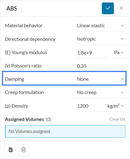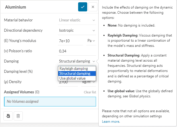 The material damping has its origin in the physical behavior of the material. Damping (and thus energy dissipation) is observed due to internal friction of the material. Several models are available in SimScale to mimic this behavior.