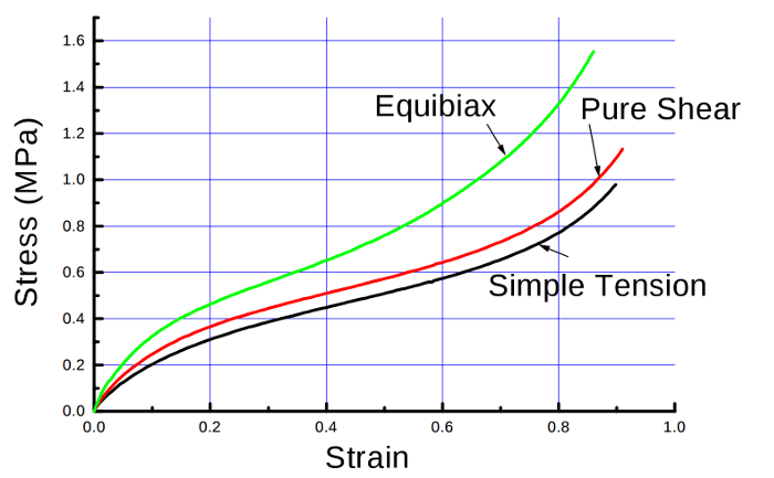 The final piece of the puzzle to be able to fully characterize the hyperelastic material is the definition of the stretches \( \lambda_i \), which are determined by the loading state. The same material will have different behavior depending on how it is loaded, as shown in the following plot (taken from Axel Product, Inc.). In a typical test, the specimen is subjected to the desired load state, and the stress-strain relation is measured.