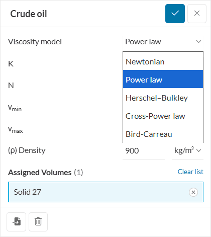 The Power law fluid model is a type of generalized model. It gives a basic relation for viscosity, \(\nu\), and the strain rate, \(\dot{\gamma}\). In this model, the value of viscosity can be bounded by a lower bound value, \(\nu_{min}\), and an upper bound value, \(\nu_{max}\).