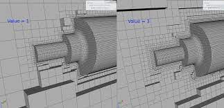 The figure below shows the difference in volume mesh around the object with a Buffer Cell Count between Refinement Levels (nCellsBetweenLevels) values of 1 and 3.