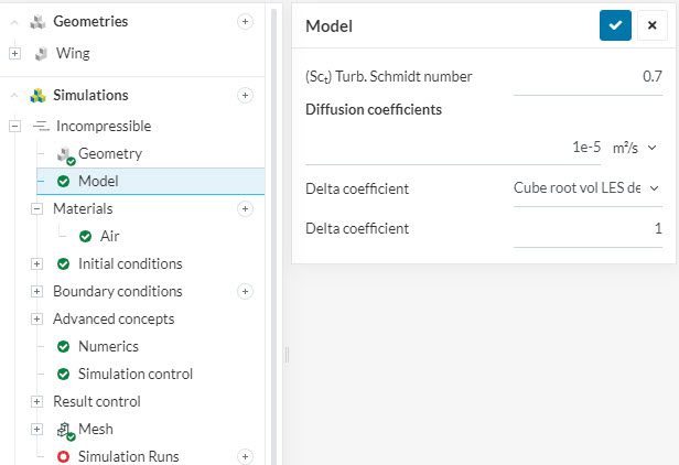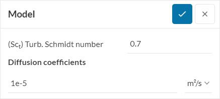 In case passive species are defined in the global settings, the Turbulent Schmidt number and the Diffusion coefficient can be specified in the model section.