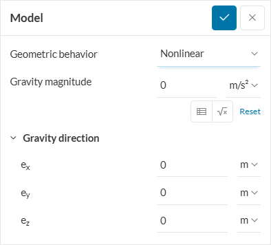 In the case of structural analysis, gravity magnitude and direction must be specified separately. Furthermore, the gravity magnitude can also be defined as a function of time via table and formula input. Please note that aligning the model with the global coordinates is always recommended, as it is easier to set up gravity and boundary conditions.