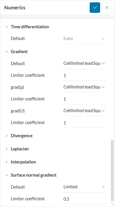 For better stability and robustness, the ‘cellLimited’ versions of both can be used. The ‘Limiter coefficient’ of 1.0 means full boundedness/limiting of values while 0 means no limiting.