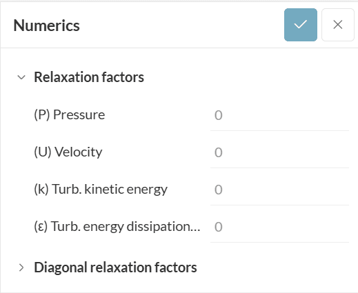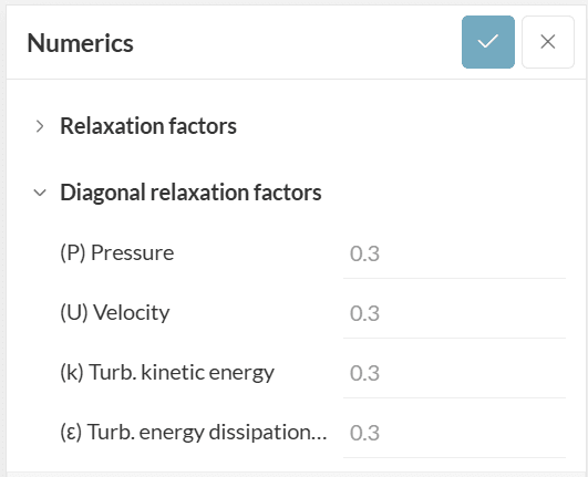 When applying the Multi-purpose solver, there are two different categories of relaxation factors in the Numerics tab that can be altered. The first type, depicted below, concerns the update of the corresponding variable involved during the iterative process.