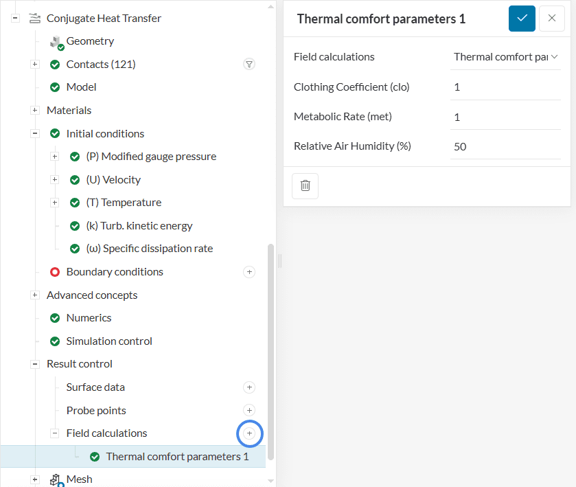 The Thermal Comfort Parameters result control is available for convective heat transfer and conjugate heat transfer analysis types.
