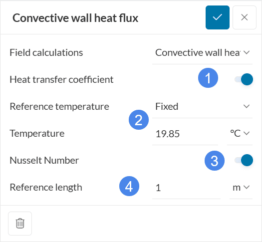 This field calculation is available in Convective Heat Transfer, Conjugate Heat Transfer v2.0, Conjugate Heat Transfer (IBM) simulations. It retrieves the heat flux (units of power per surface area (\(W/m^2\))) at each interface and boundary wall of the model. Also, it has the option to automatically compute useful quantities that describe the heat transfer, such as the Heat transfer coefficient and the Nusselt Number: