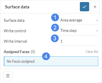 The Surface data result control item calculates statistics of result fields over the specified faces of the CAD model, such as average value or surface integral. The settings panel appears as follows: