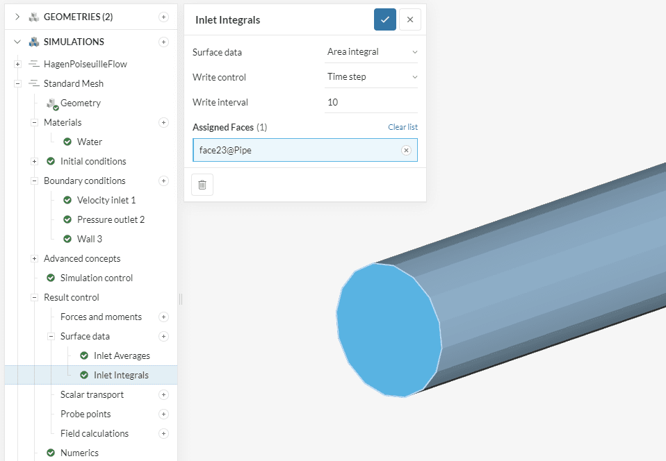 To visualize the application of the Surface data control items, let’s take the example of a pipe flow simulation, with statistics to be computed at the inlet face: