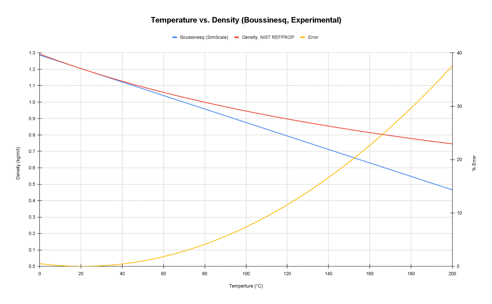 The approximation assumes a linear change in density that is dependent on temperature. It is very accurate for natural convection flows at relatively low-temperature differences from ambient. This makes it a good fit for relatively low-temperature electronics cooling, building HVAC, and thermal comfort. As flows become high speed (>120 m/s) or high temperature (> 100 °C), the approximation becomes less accurate as the linear assumption between temperature and density is no longer valid.