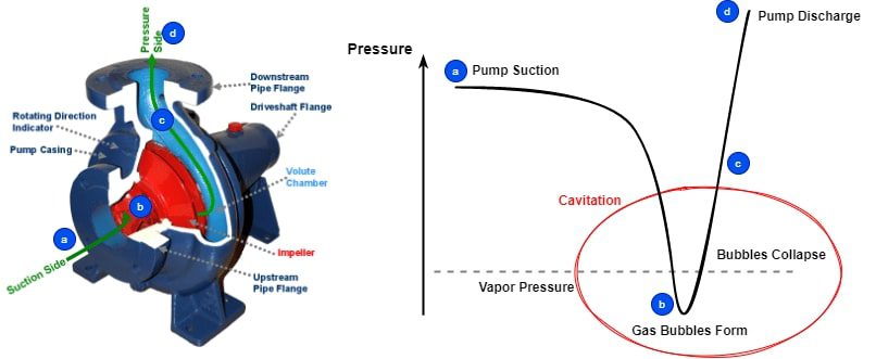 NPSH is used in the design of pumps and hydraulic systems as a key driving parameter governing whether or not cavitation will occur within the pump. Cavitation occurs when the local inlet pressure falls too low, causing pockets of low-pressure vapor to form in the fluid stream. These vapor bubbles can collapse violently against pump components, resulting in micro jet formations that can cause significant damage to both the pump itself and possibly other downstream equipment.
