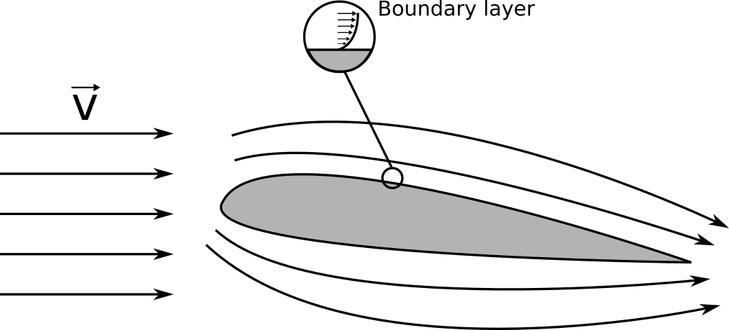 The section of a body, such as a wing, is represented in a current flow. The boundary layer is the region where viscosity effects are most significant in body-fluid interactions.