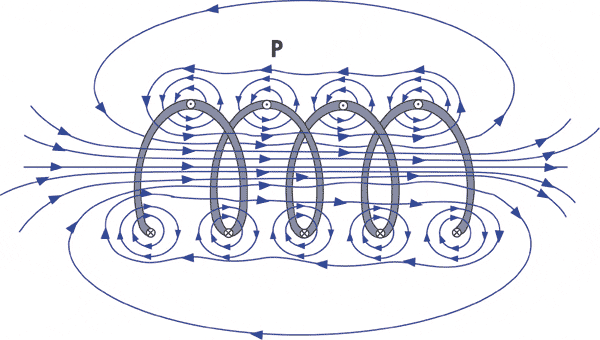 If this wire is wound into a coil, the magnetic field around that coil is significantly intensified. This is because by adding more loops to a coil, the magnetic fields generated by each individual loop combine to create a focused magnetic field along the center of the coil. This interaction is illustrated in the figure below, which depicts a loosely wound coil.