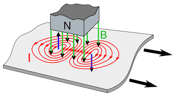 Figure 6 illustrates the interaction between a moving conductive metal sheet and a stationary magnet. As the sheet approaches the left edge of the magnet, it encounters an increasing magnetic field, leading to the generation of counter-clockwise eddy currents. These eddy currents create their own magnetic fields that oppose the external magnetic field, giving rise to a phenomenon known as magnetic drag or magnetic damping.