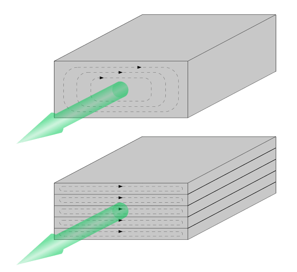To minimize power losses, transformers often employ a laminated core, as depicted in Figure 7 below. Unlike a solid core, the laminated core consists of thin steel laminations with a nonconductive coating on their surfaces. This configuration prevents eddy currents from traversing between laminations, limiting them to flow within each individual lamination. By confining the eddy currents to a smaller area, their magnitude is significantly reduced, resulting in decreased energy dissipation within the core.