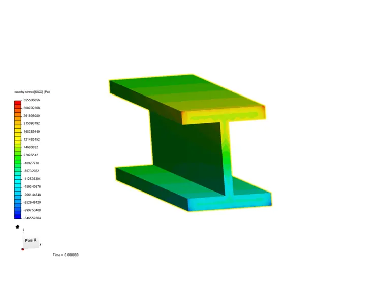 Bending a beam, like any other structure, would mechanically deform it, either elastically or plastically, depending on the material’s yield strength and the stress magnitude. Here’s an example of stress analysis in a beam. Using FEA static analysis in SimScale (explained in the following section), the designer analyzed the bending stress, axial tension, and compression in the flanges.