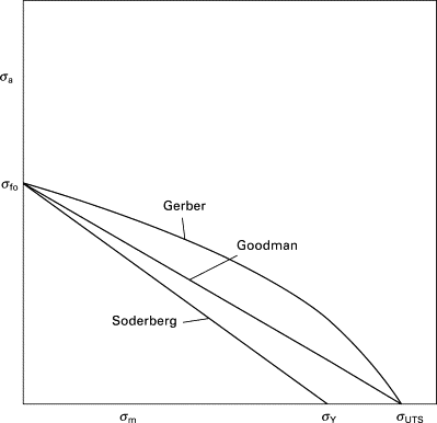 From mean stress values obtained by simulation, it is possible to use relationships such as the Gerber, Goodman, and Soderberg that relate mean stress amplitudes to fatigue life, also known as constant life diagrams. The figure below provides an example of the constant life diagrams.