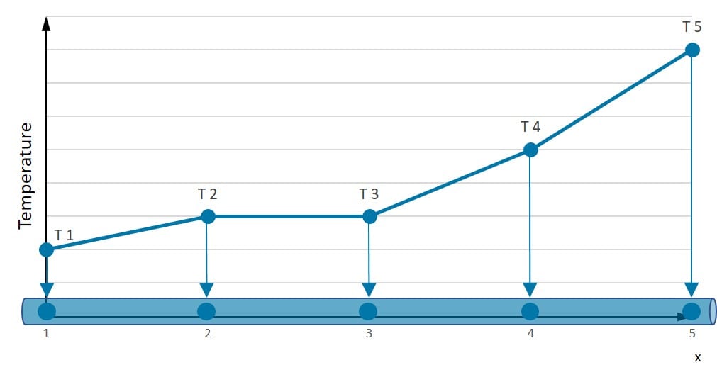 Let’s assume we know the temperature of this bar at five specific positions (Numbers 1-5 in the illustration). How can we predict the temperature between these points? A linear approximation is quite good, but there are better possibilities to represent the real temperature distribution.