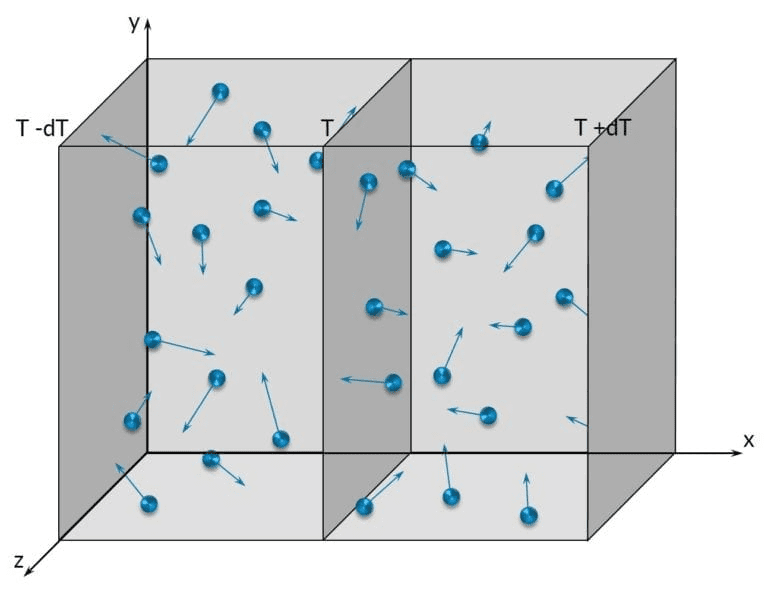 The internal energy of the molecules is transferred by impact with other molecules. As a result, areas with low temperatures will be occupied by molecules of high temperatures and vice-versa. The thermal conductivity can be explained with this model and be derived from the kinetic theory of gasses [4]: