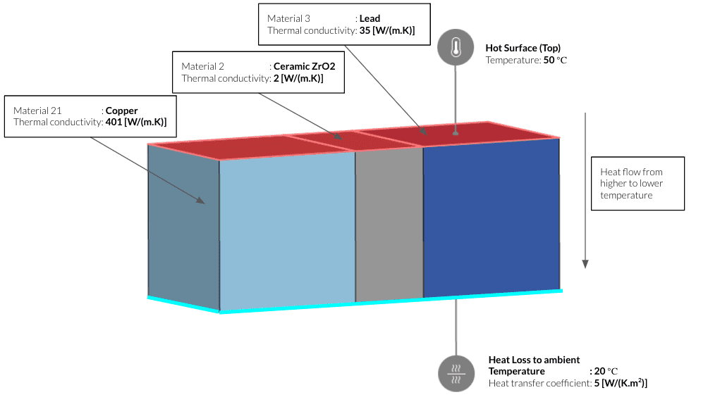 An example heat transfer analysis shows how the heat flows within materials with three different thermal conductivities. The case is set up with a fixed temperature on the top and a convective heat loss on the bottom.