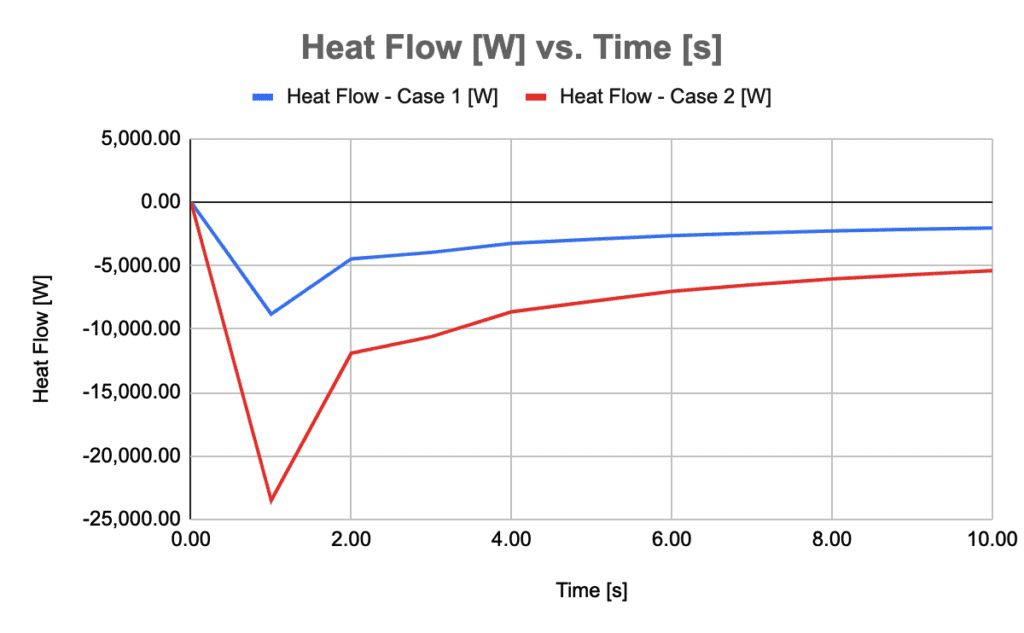 With the exact material properties and 10 seconds of transient simulation, the heat flux through the second case is much higher than the first due to a greater temperature difference. This can be seen quantitatively using the heat flow result monitor on the hot surface.