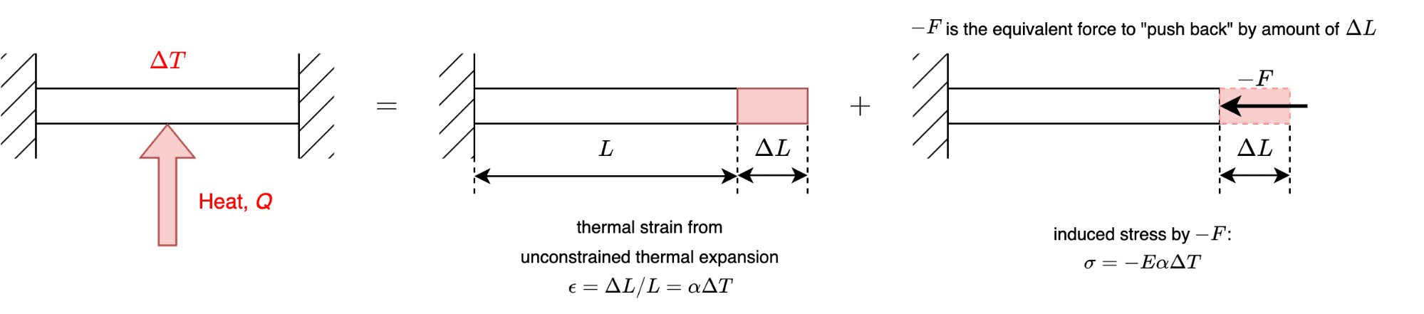 Thermal stresses in structures arise when the temperature rises uniformly in solids with physical constraints. A uniform-temperature increase in a beam with fixed ends will induce compressive stresses equal to \(\sigma = E \epsilon_T – \alpha E \Delta T\). We derive this by the following superposition of the situations: