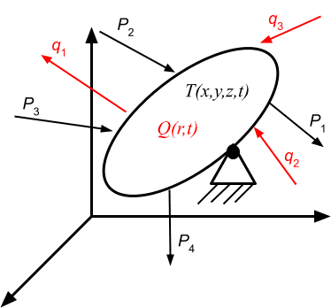 Figure 4 shows a solid with a temperature field distribution T(x, y, z, t) produced by thermal fluxes \(q_1, q_2, q_3, … \) and a heat source or sink represented by Q. The solid is also subject to mechanical forces \(P_1, P_2, P_3, P_4, … \). If we discretize the solid into finite elements, we can describe the strain of the elements as: