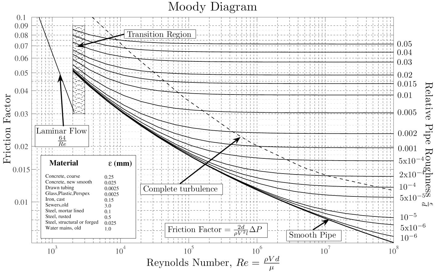 The friction on the pipe surface due to roughness is an effective parameter to consider because it causes laminar to turbulence transition and energy losses. The ‘Moody Chart’ (Figure 4) was generated by Lewis Ferry Moody (1944) to predict fluid flow in pipes where roughness was effective. It is a practical method to determine energy losses in terms of friction factor due to roughness throughout the inner surface of a pipe. The critical Reynolds number for a pipe with surface roughness abides by the regimes above\(^2\).