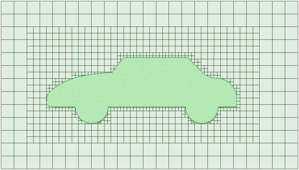 In the following figure, an example of an external mesh around a vehicle body is used to explain the meshing process. The first image below shows the Base Mesh Box around the object.