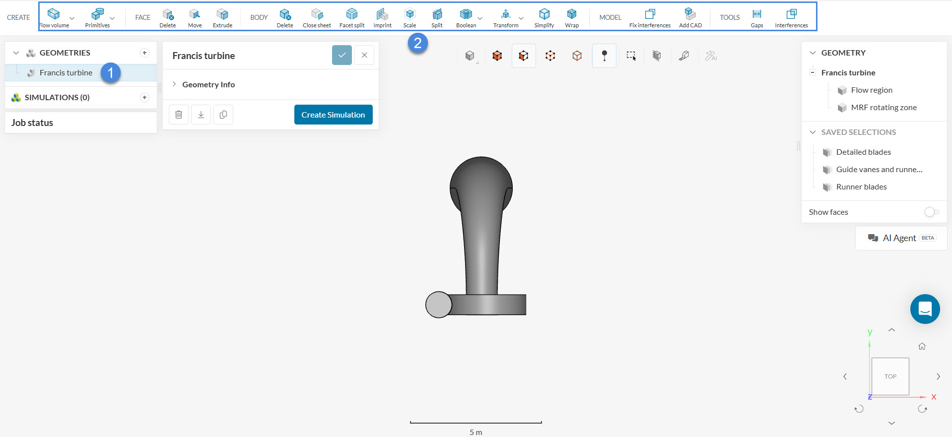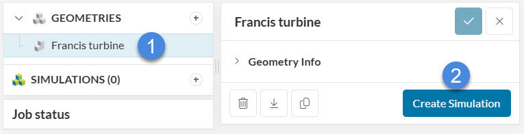 To start the simulation setup process select the Francis turbine geometry to access further options.