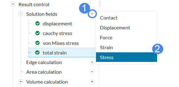 Result control allows us to query specific result fields from the simulation, such as displacements, strains and stresses, and their characteristics such as average or maximum values. A few default fields are provided, but in this case we will need to add more: