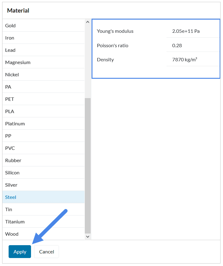 In order to create a new material, click the ‘+’ icon next to Materials. The materials library will be shown. Select the desired material from the list and click ‘Apply’ to create the material item, as shown in the picture: