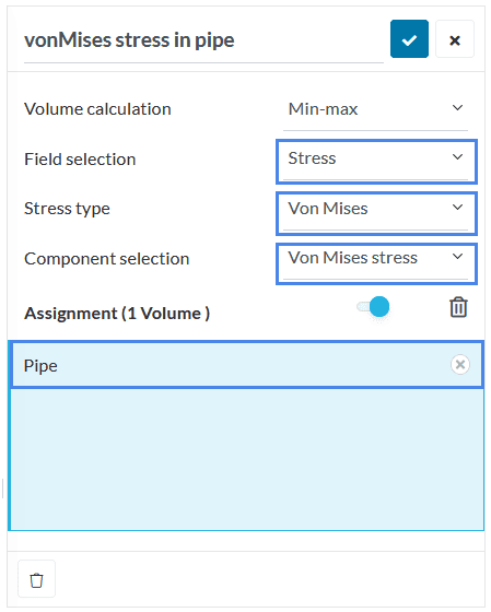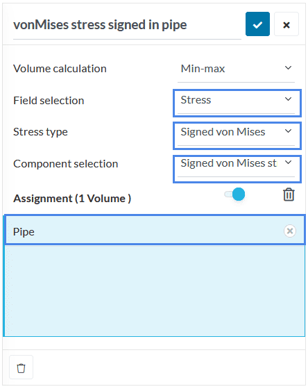 Use the steps above to create a Volume calculation – Min-max item, and setup for the von Mises stress field over the pipe, as shown in the picture: