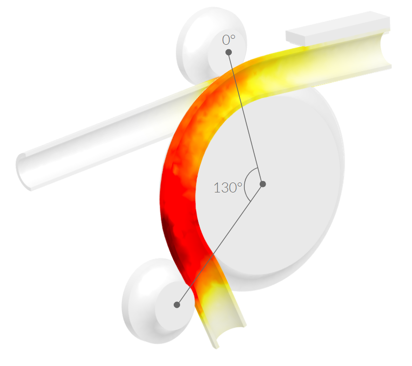 It is important to take into account the right-hand rule and the direction of the rotation axis specified to get the correct direction for the rotation. In this case, we want a positive 130° rotation of the roller to achieve the desired bending angle on the pipe.