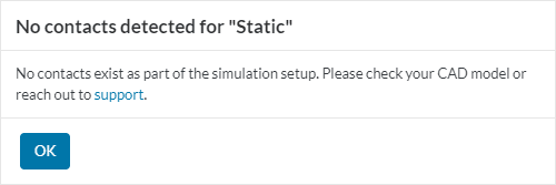 SimScale automatically detects any touching faces within the geometry and assigns bonded contacts. In this case, all contacts are only on a line of touch, so the automatic detection fails with the following message: