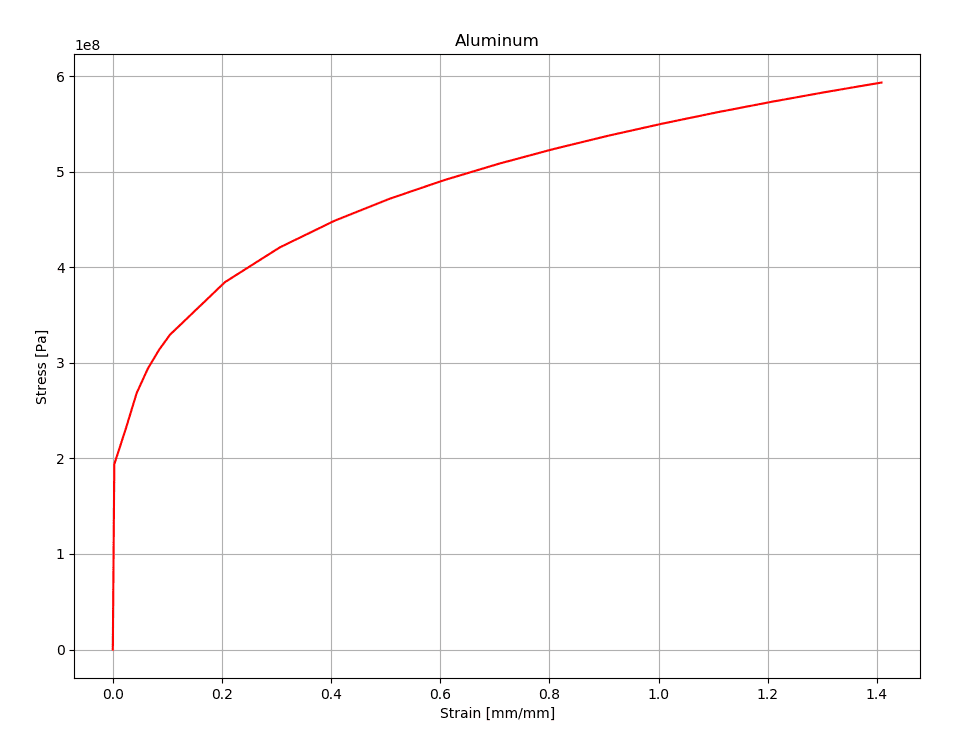 The solver needs the stress-strain curve, for aluminium pictured in Figure 12, for the material in order to predict the deformation. We will provide this curve in the form of a table. Use the following button to open the spreadsheet containing the curve data: