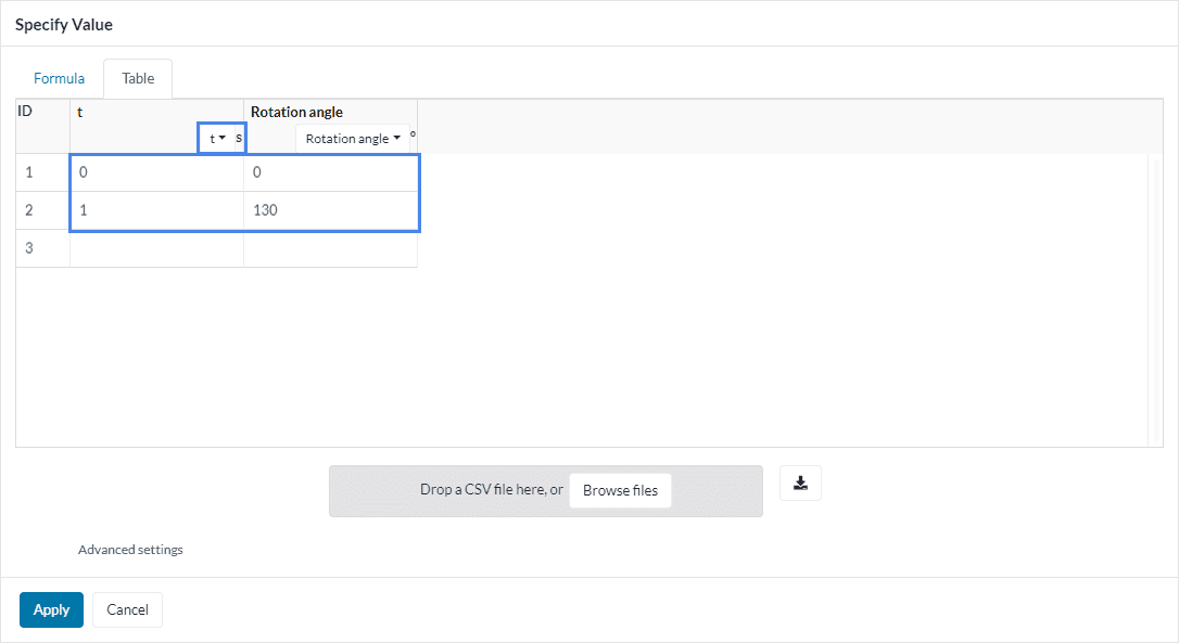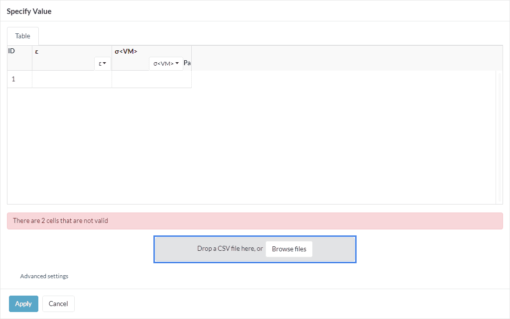 The Specify value window appears, just as in the material case, but this time with Formula and Table input options. Select the Table tab and input the values as shown: