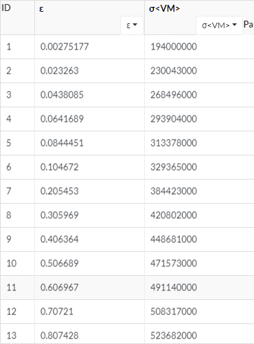 Click the ‘Browse files’ button to select and upload the previously downloaded CSV file. The \(\varepsilon – \sigma\) table should populate with the data as follows: