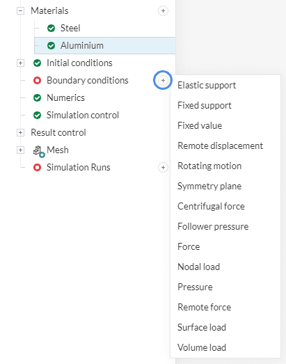 In order to create a boundary condition, follow this procedure: click on the ‘+’ button option next to the ‘Boundary conditions‘ element at the left panel, and select the required boundary condition type from the drop-down menu, as shown in the figure: