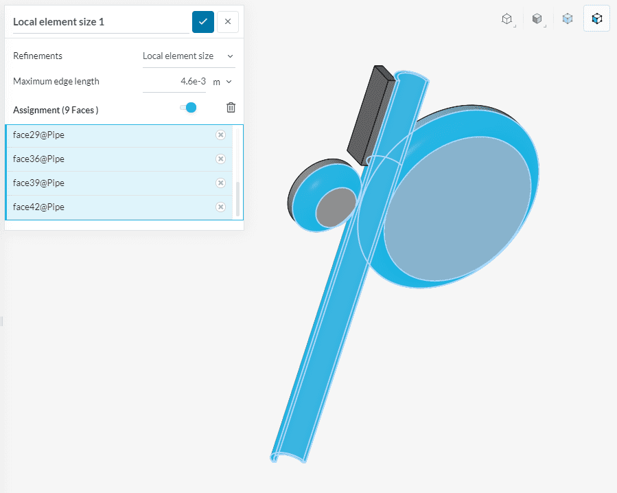 Select the indicated faces (9 in total) from the viewer as shown in the picture, and then, apply a Maximum edge length of 4.6e-3 \(m\). This value corresponds to the pipe wall thickness and will ensure a good aspect ratio of the elements.